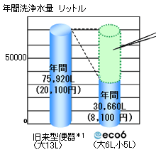 INAXの「超節水eco6トイレ」はトイレ洗浄の際に使用される水量を大洗浄6L、小洗浄5Lに節水。旧来型便器大13Lよりも60%の節水を実現し、なんと水量面では2日間でお風呂1杯分以上、水道料金面では年間12,000円以上もお得です。洗浄水量を減らしたから洗浄量力が弱くなったわけではなく、洗浄方式を変える事により6Lでも十分便器の汚れをしっかり洗浄する事が出来ます。皆さんも地球にもお財布にも優しいトイレを使ってみては?