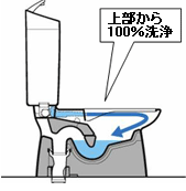 上から100%流す強力洗浄!!便器底のゼット口(こう)からの洗浄水をなくし、上から100%流す強力な洗浄により、わずか6リットルでも便器内の汚れもしっかり洗い流します
